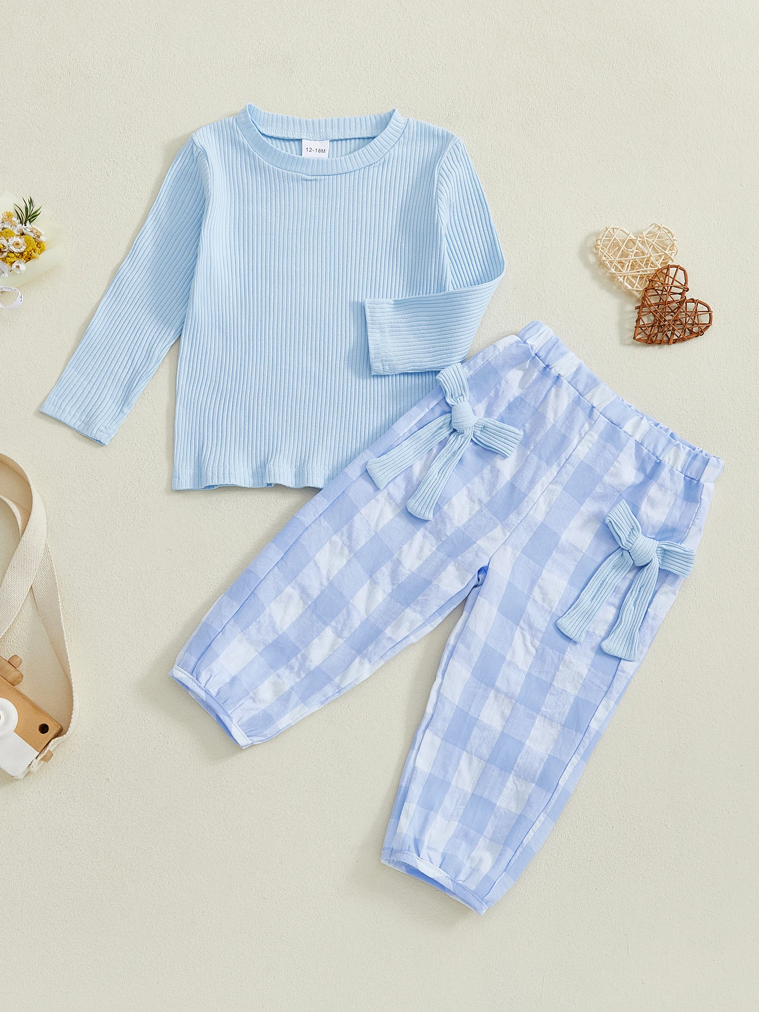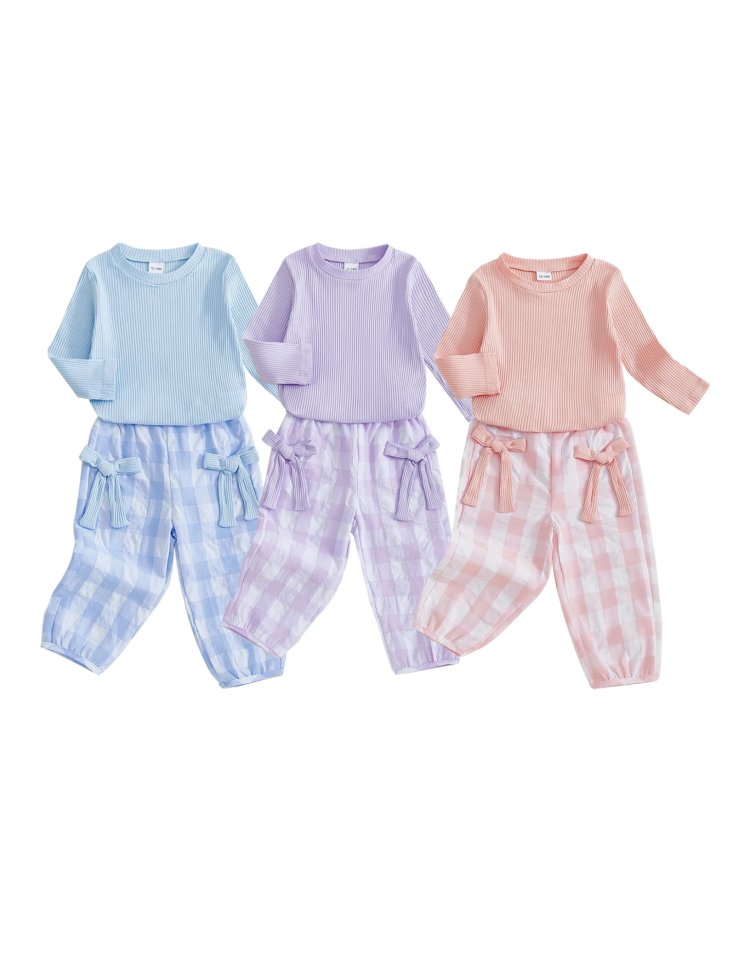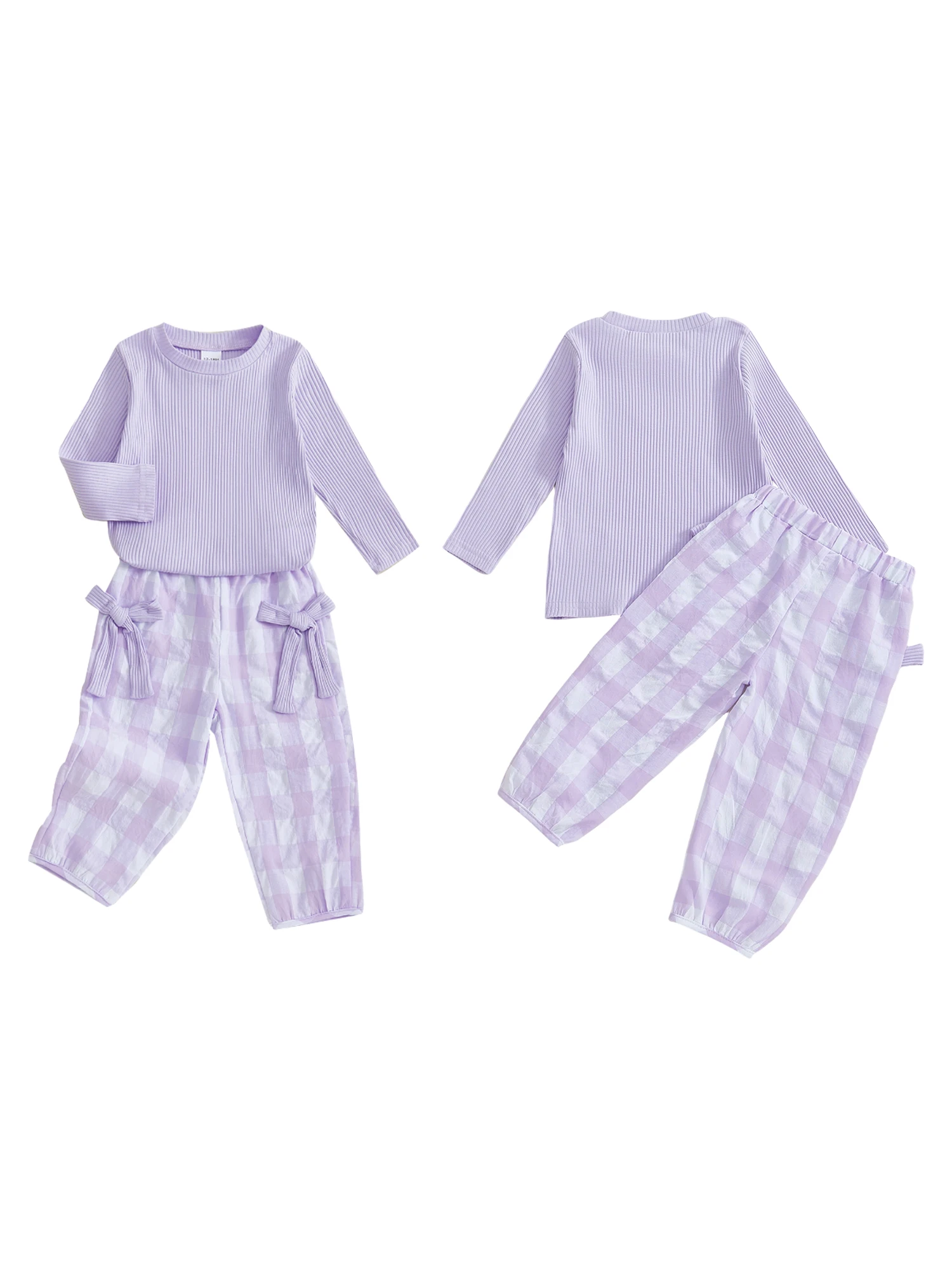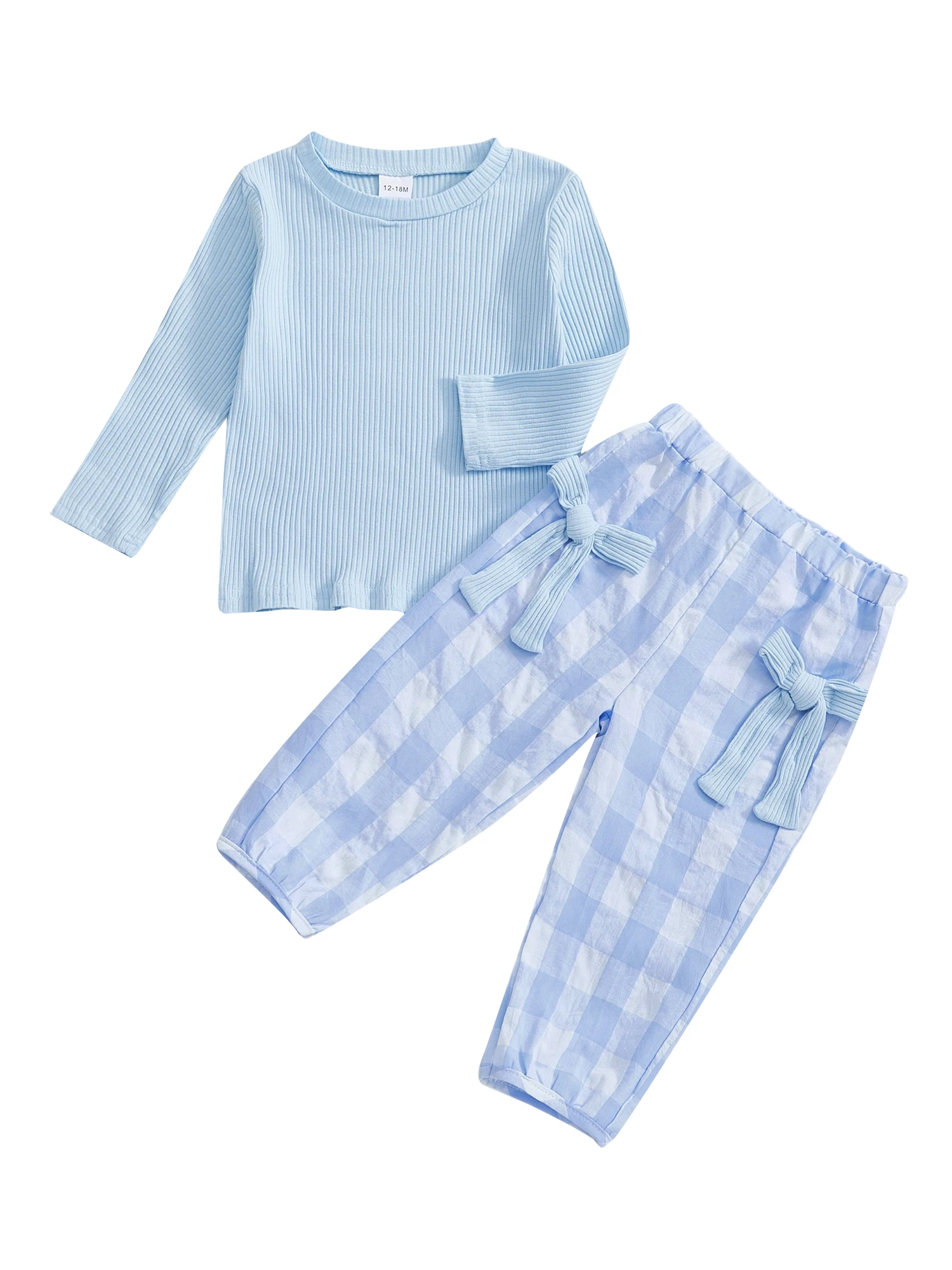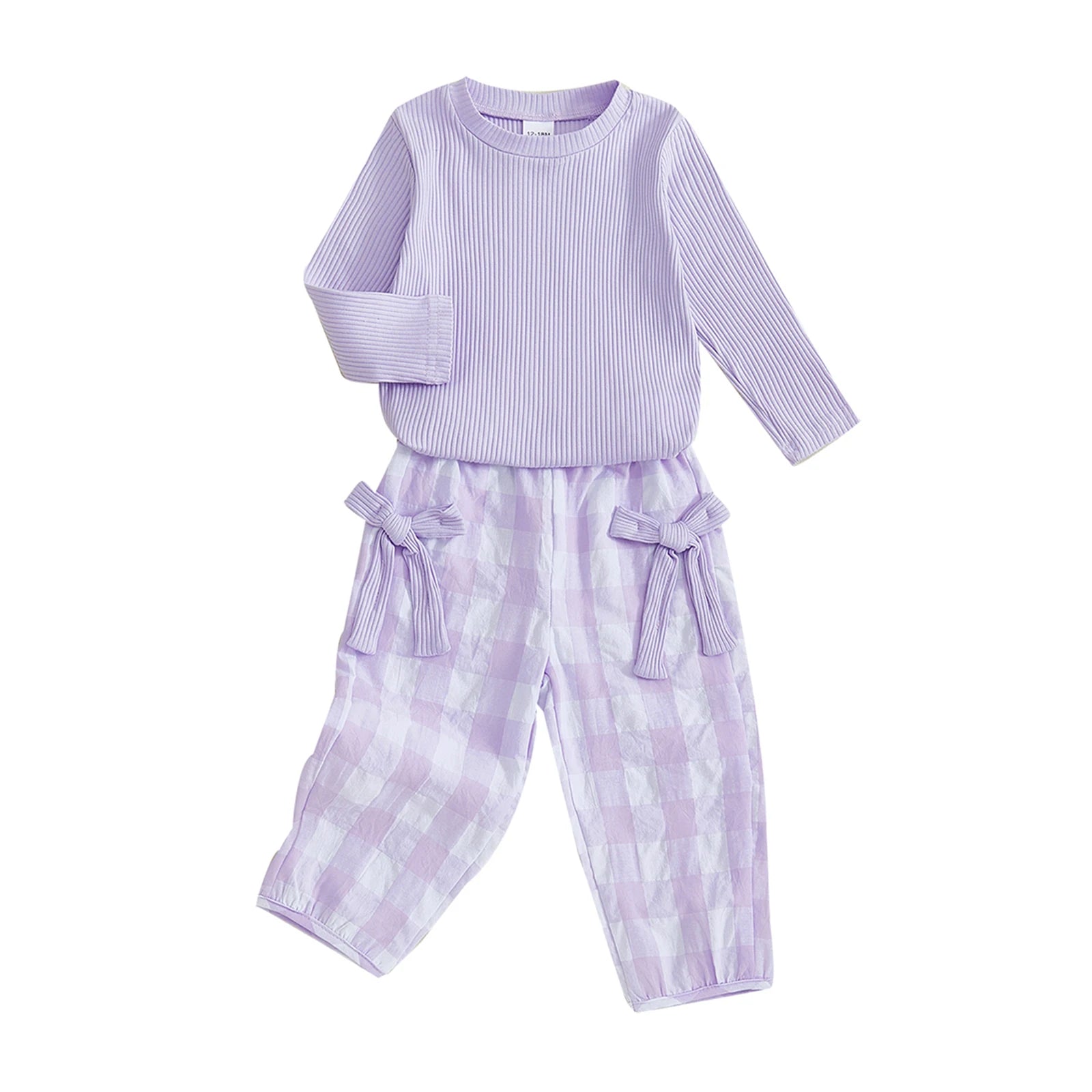 Toddler Little Girl Fall Outfit Solid Ribbed Long Sleeve Tops Plaid Elastic Waist Pants with Bows 2 Piece Set