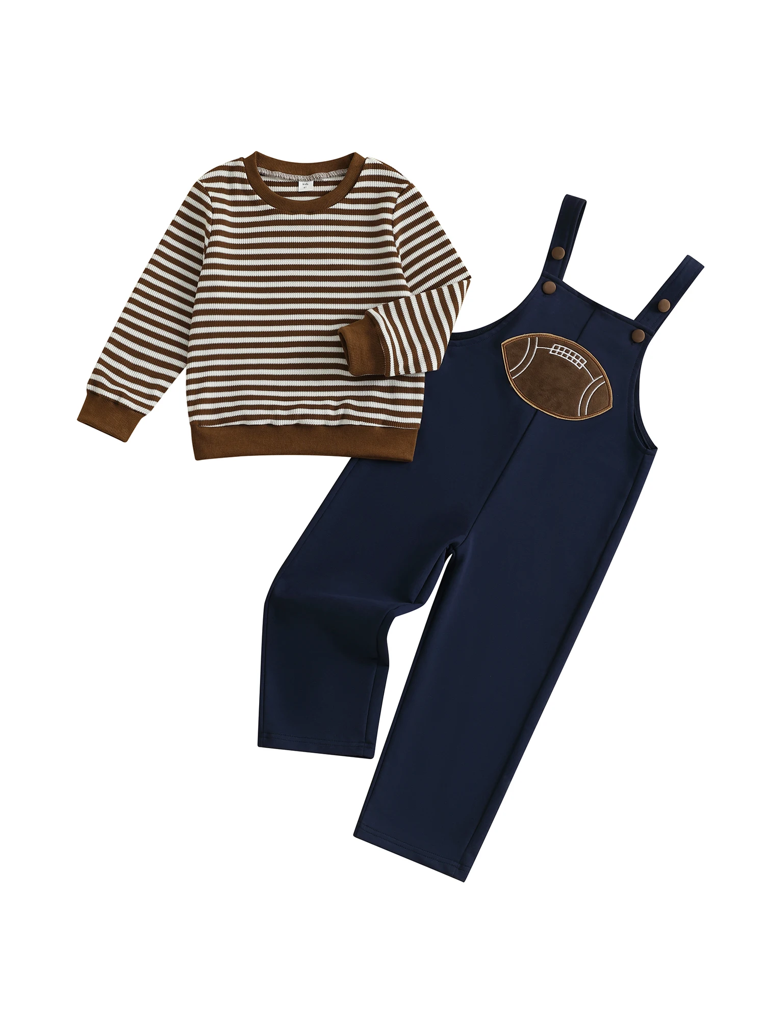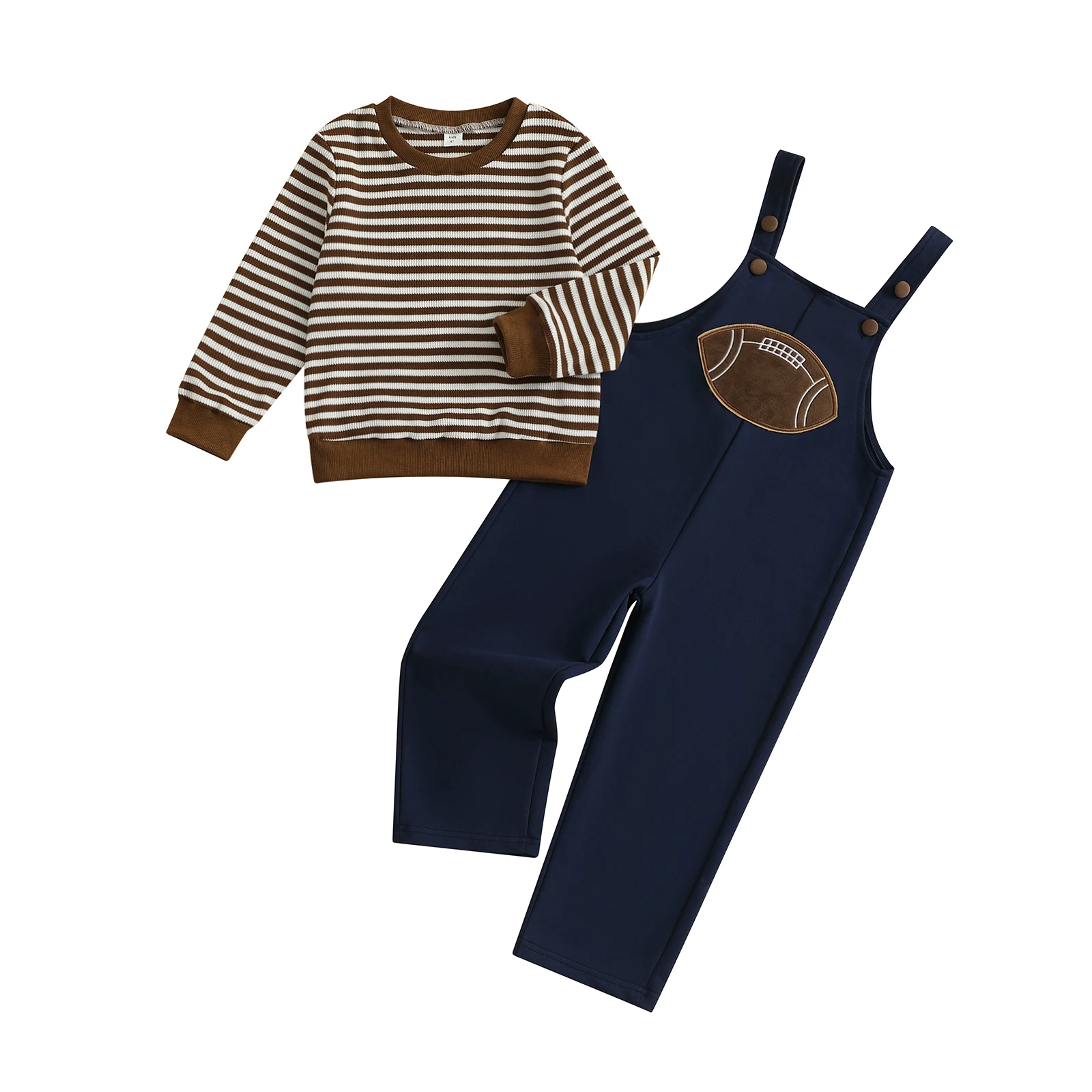 Toddler Boy Fall Clothes Stripe Long Sleeve Round Neck Pullover Embroidery Overall Pants 2Pcs Outfits