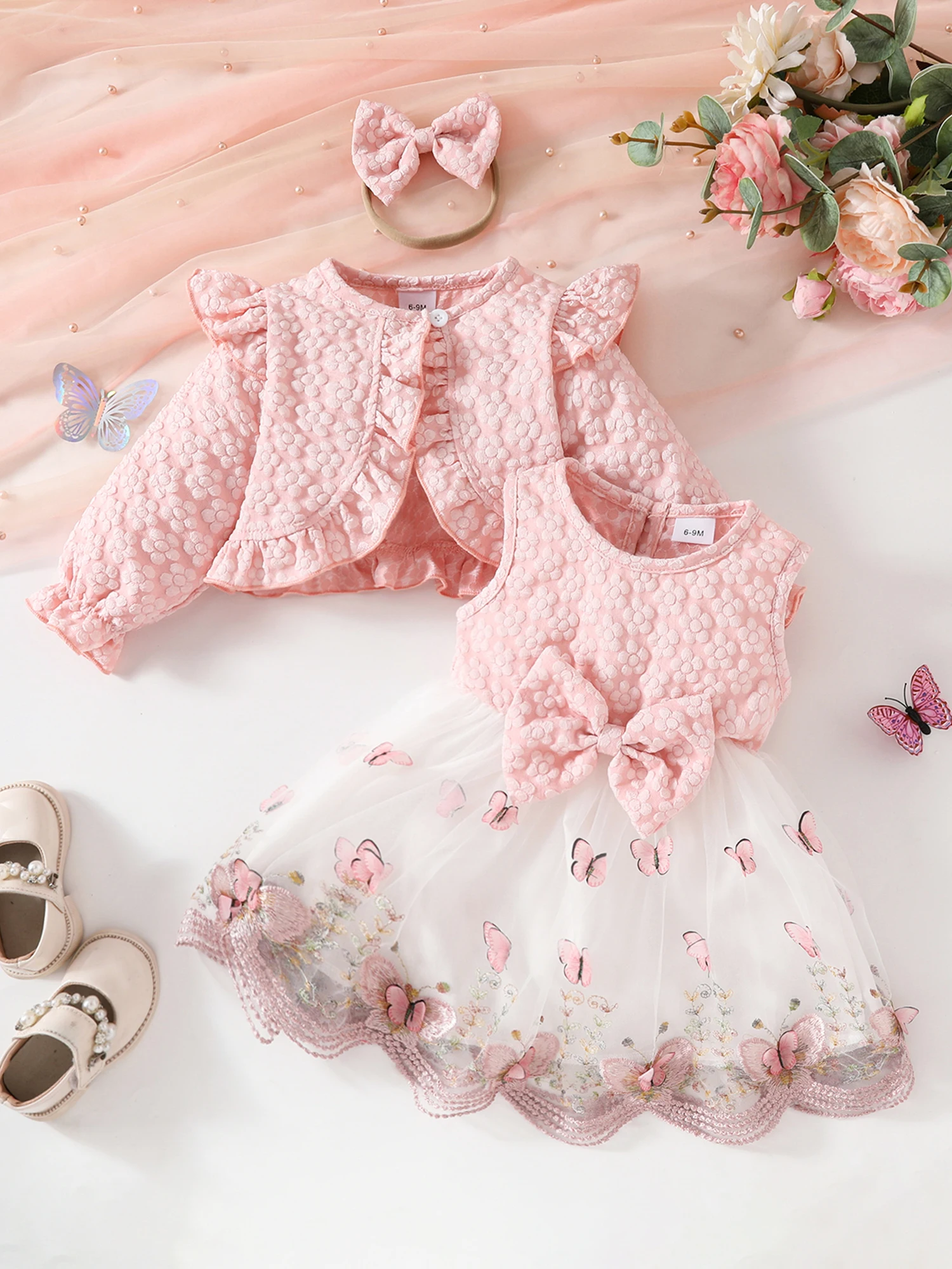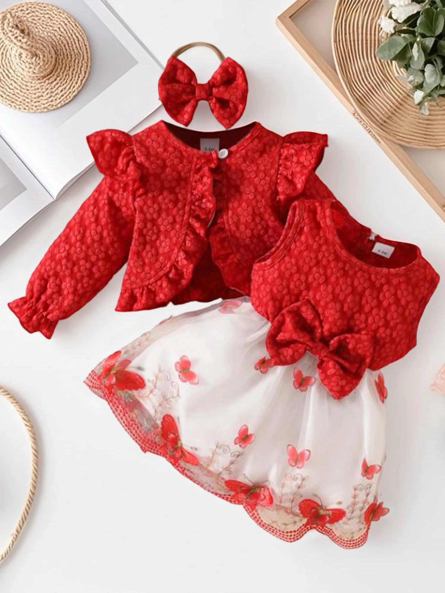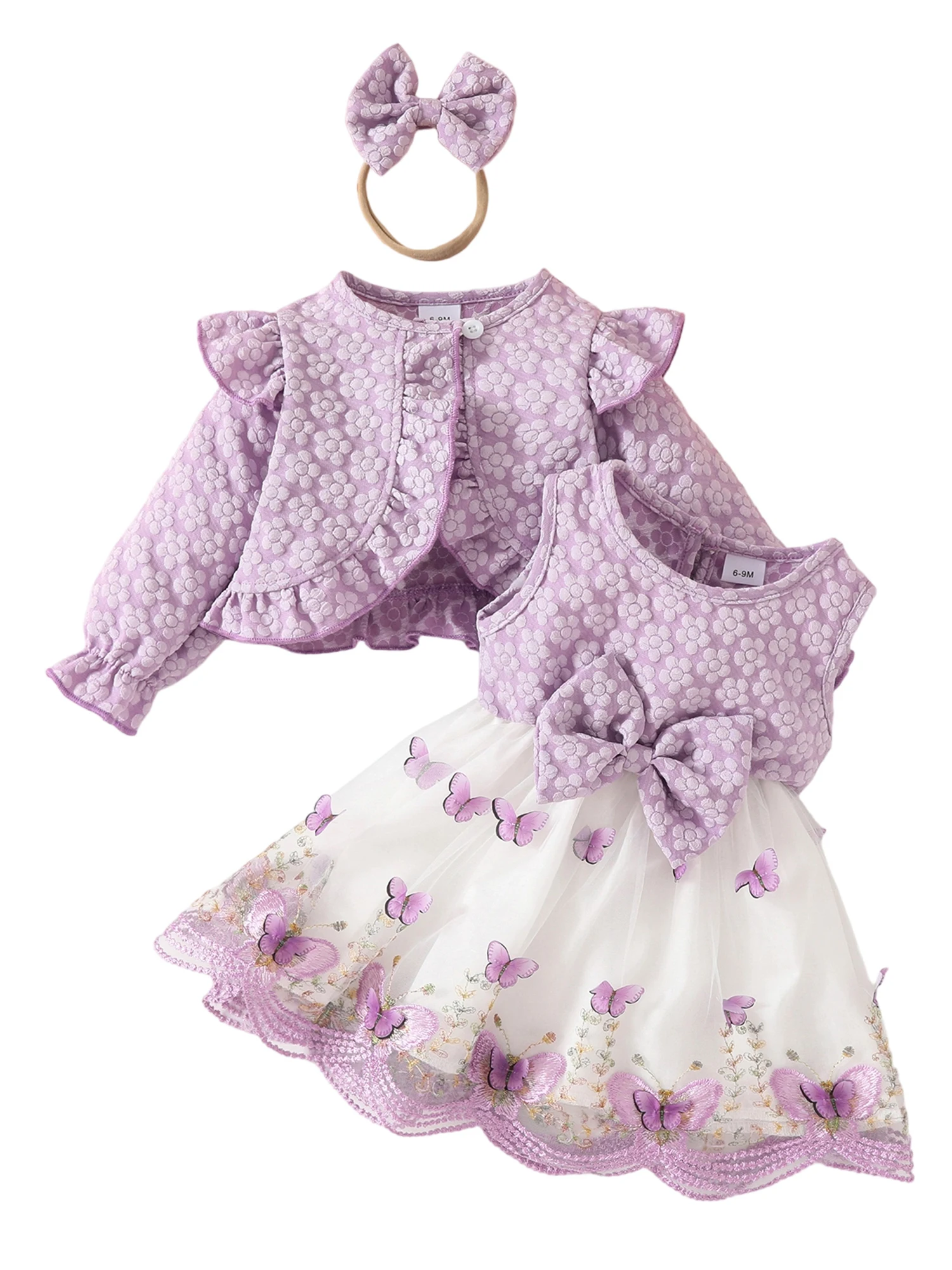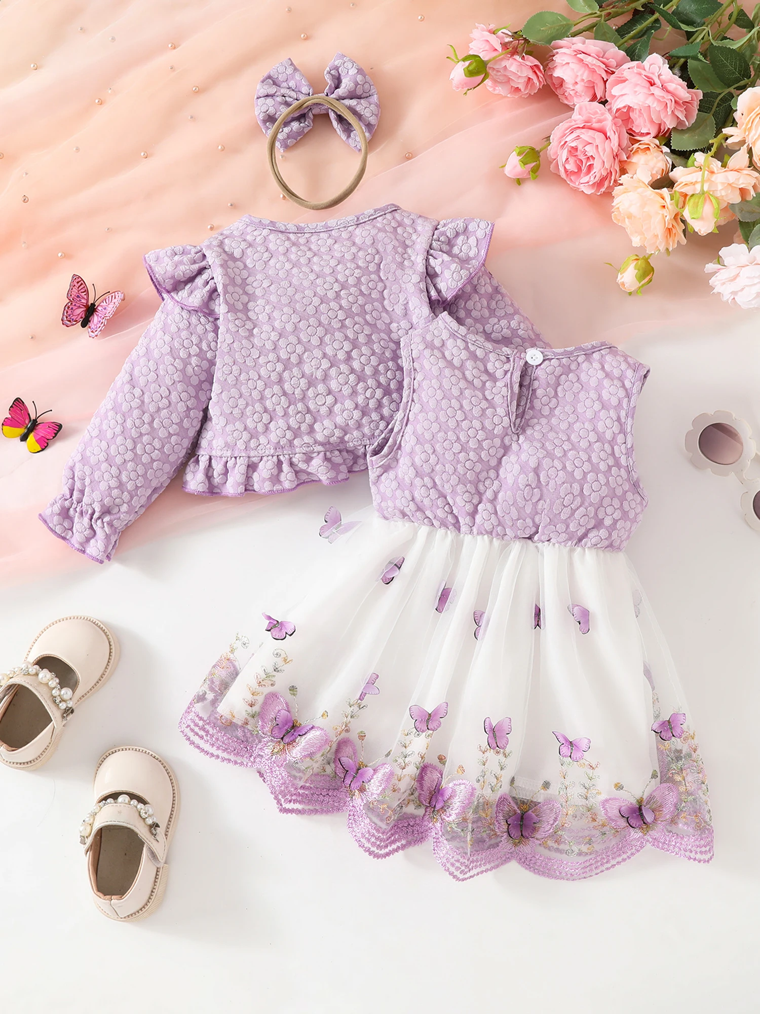 Toddler Girl Fall Outfits Butterfly Print Mesh Round Neck Sleeveless Tank Dress Long Sleeve Coat Headband 3Pcs Clothes Set
