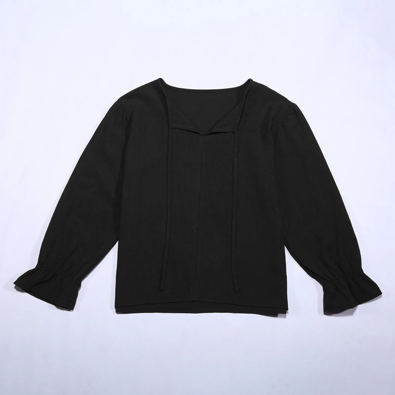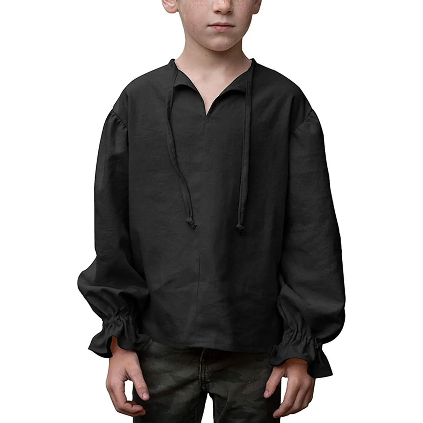 Feature:Boy's long sleeve retro cosplay costume tiops features v neck with drawstring detials, loose fitting, drop shoulder, ruffled elastic cuffs, solid color, unique vintage style, soft and breathable fabric