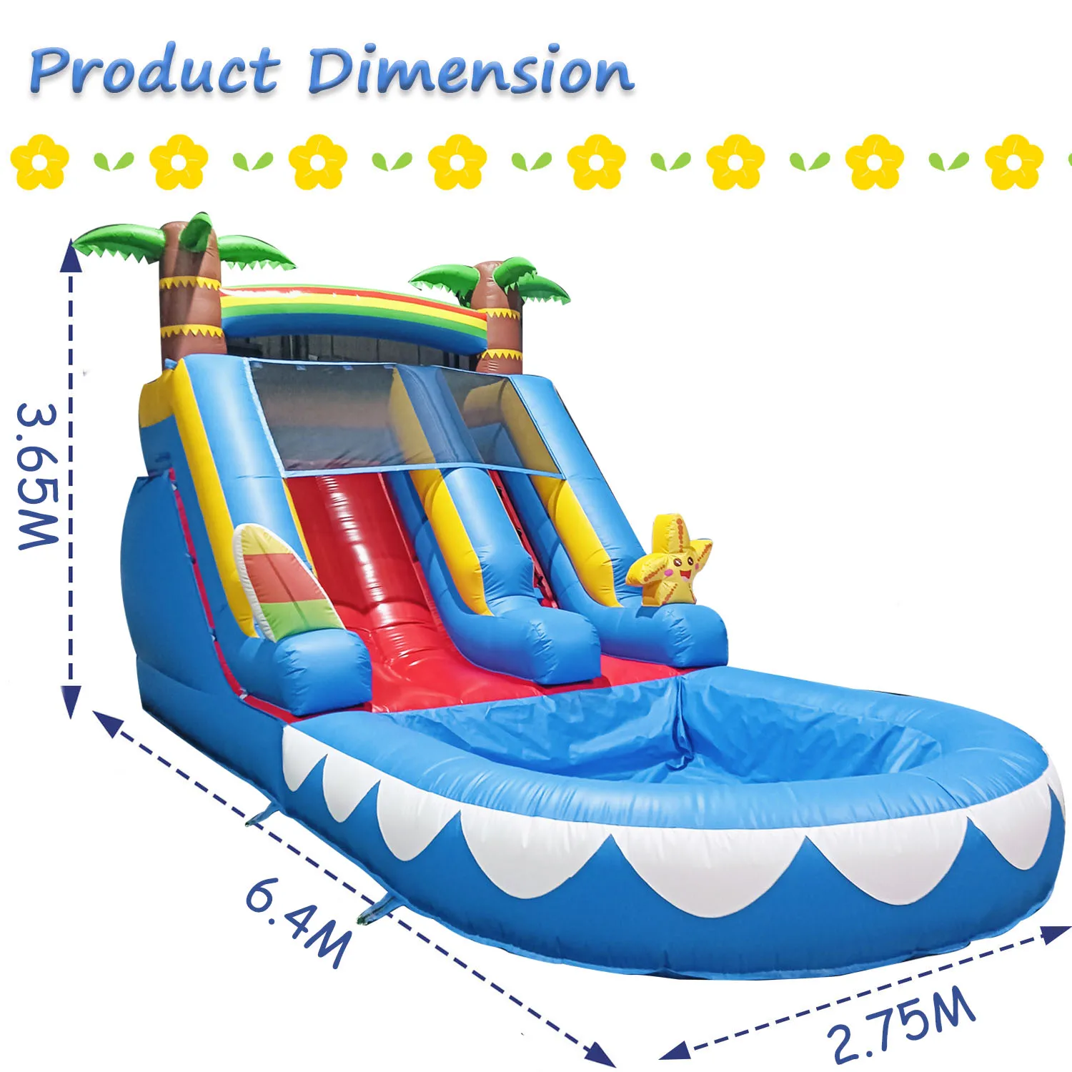 SAFE and FUN DESIGN -- Our inflatable water slides for kids are thoughtfully designed with the safety of your children in mind. The large mesh windows made from ripstop PVC netting that won't tear like cheaper fabric mesh and allows for effortless supervised viewing. The tropical rain forest design will bring fun outdoor playing experience to your children.