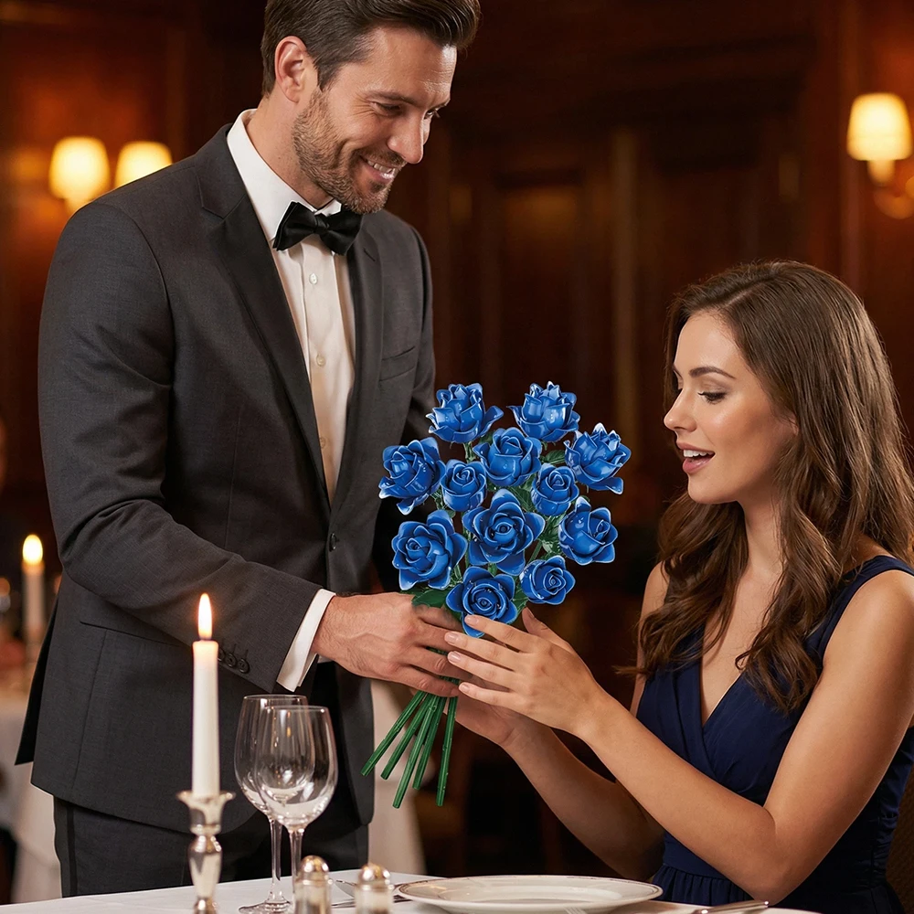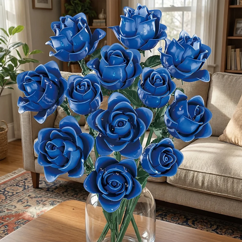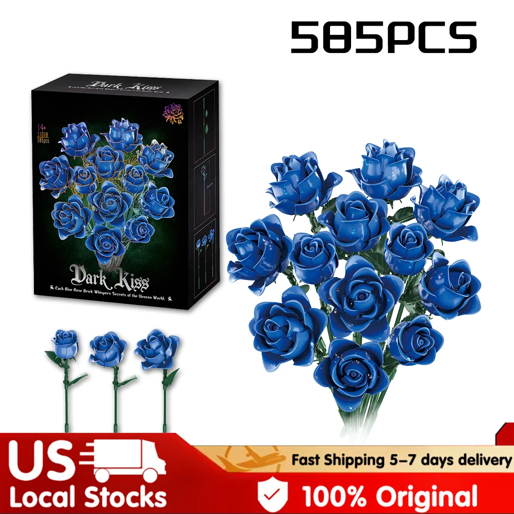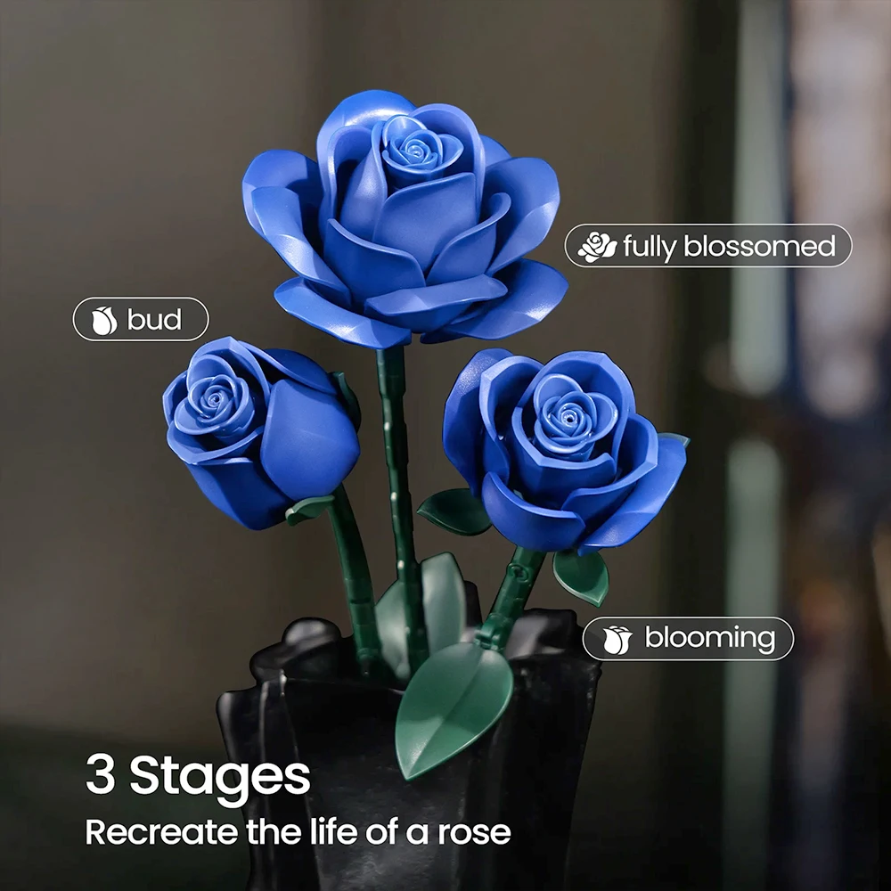 Elegant Blue Roses Bouquet Eternal Building Blocks 585 PCS Valentine's Day Girlfriend DIY Gift MOC Home Decor Ornaments Kids Toy