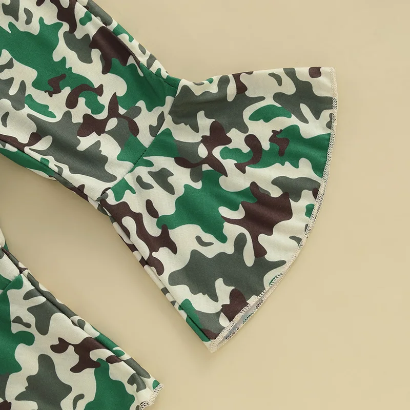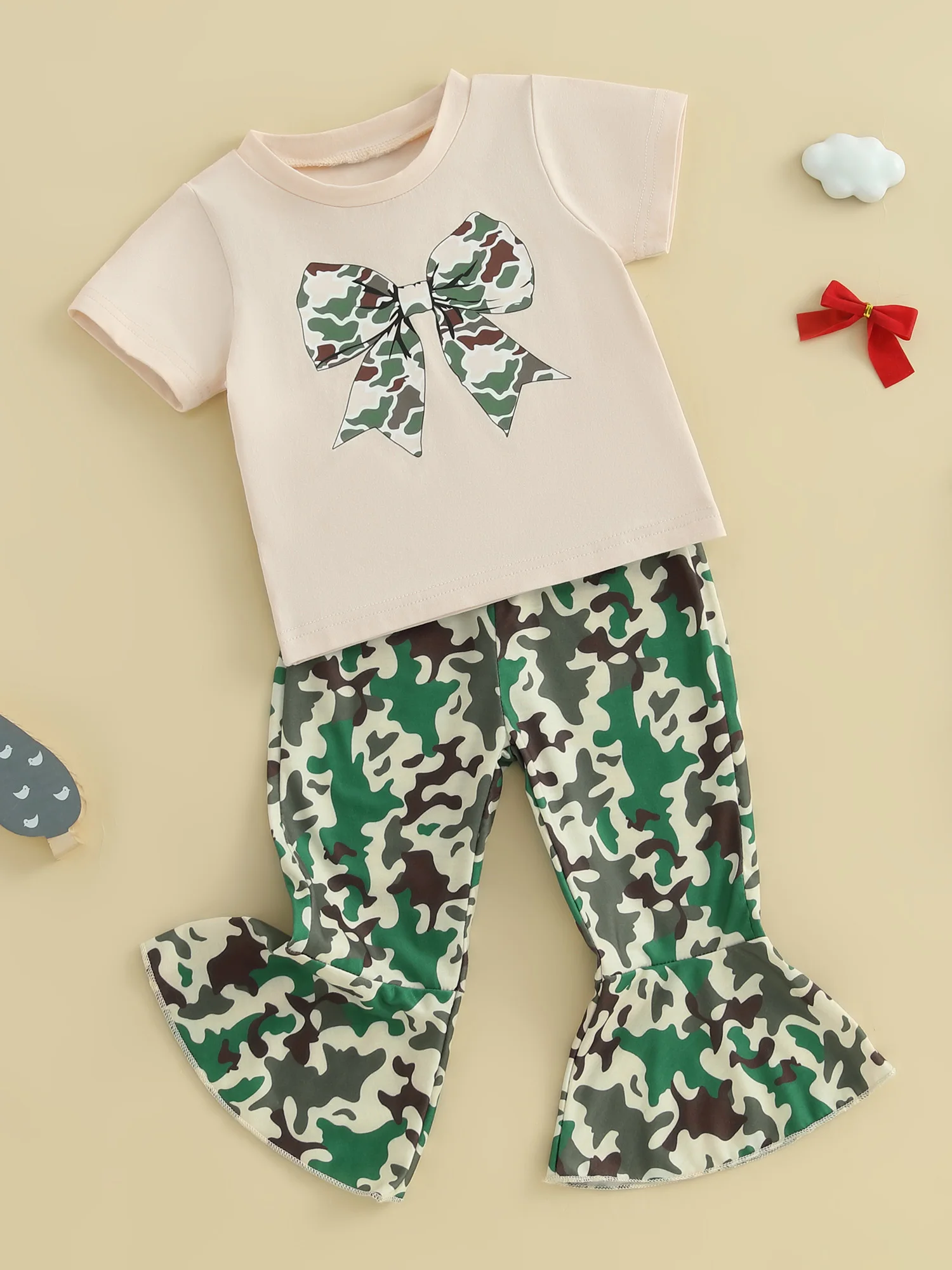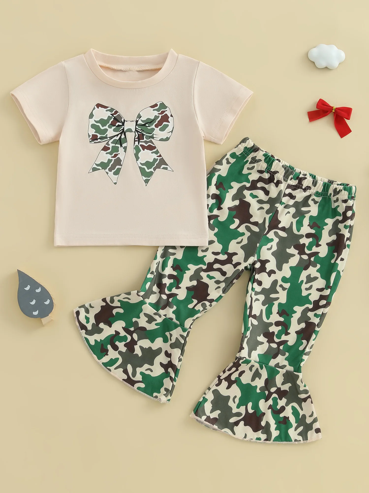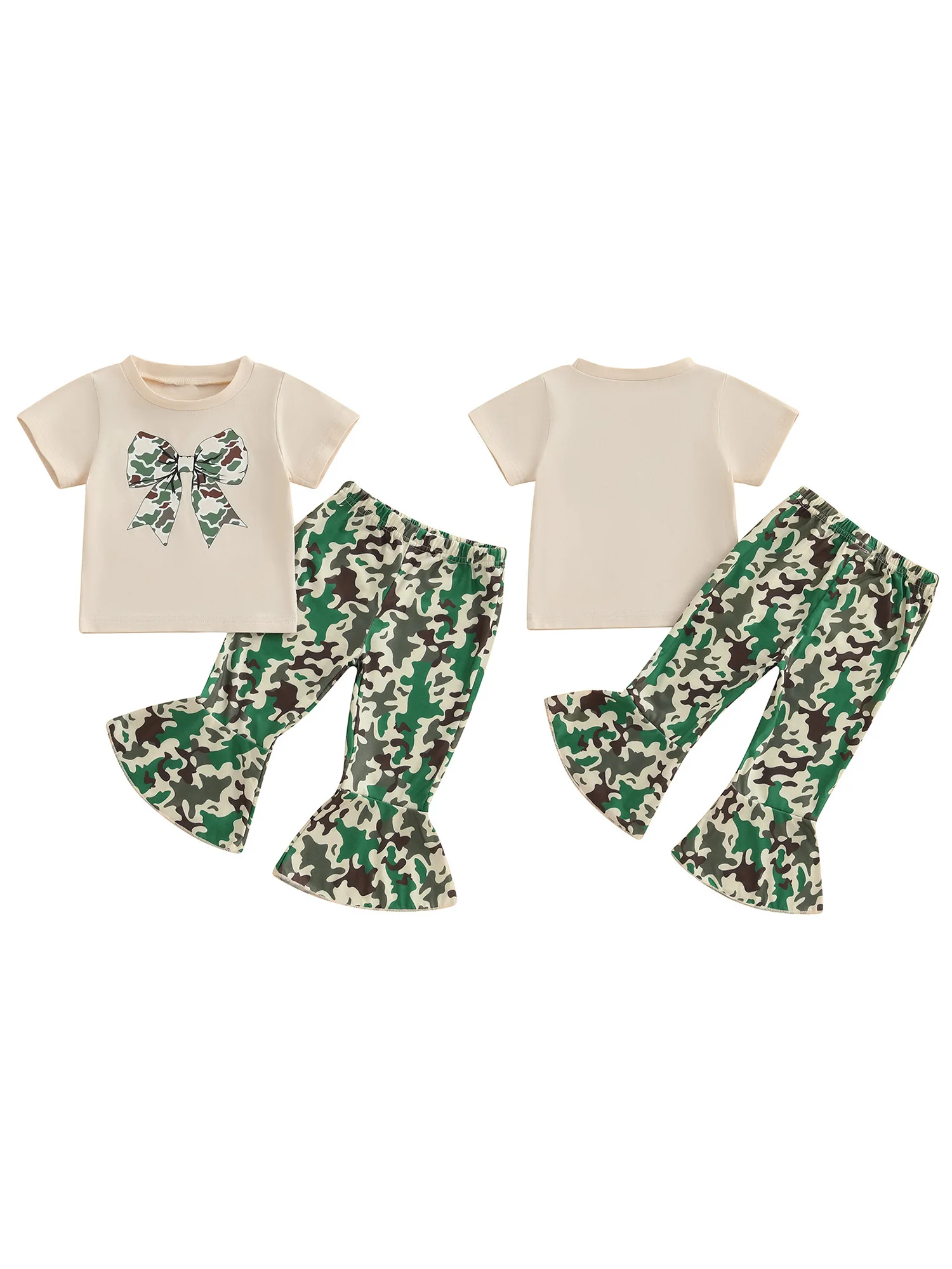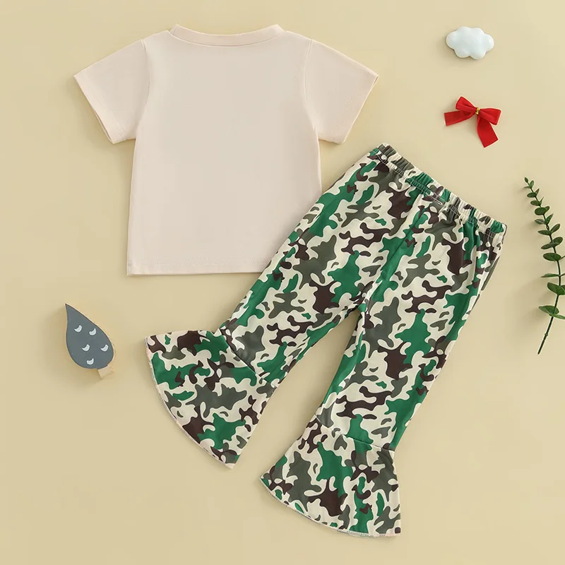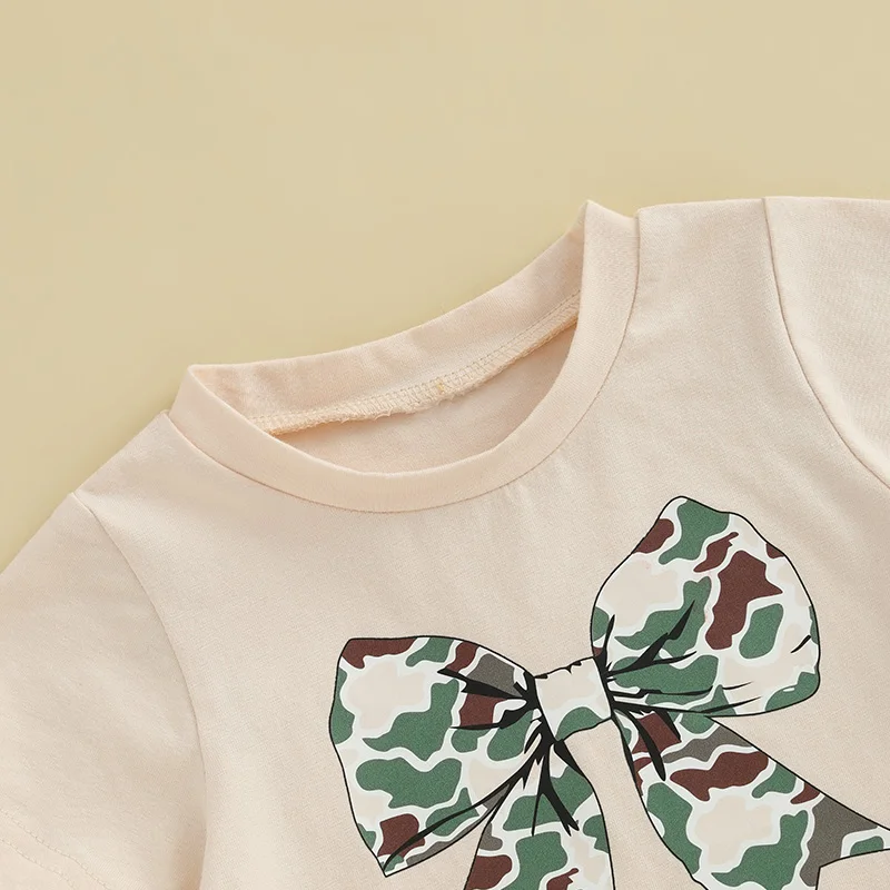 Girls fashion outfit; Baby girl t-shirt with bow print, adding a touch of fashion, short sleeves, round neck; Baby girl flared pants with camouflage print and elastic waist design, simple but fashionable, make your baby stand out in the crowd