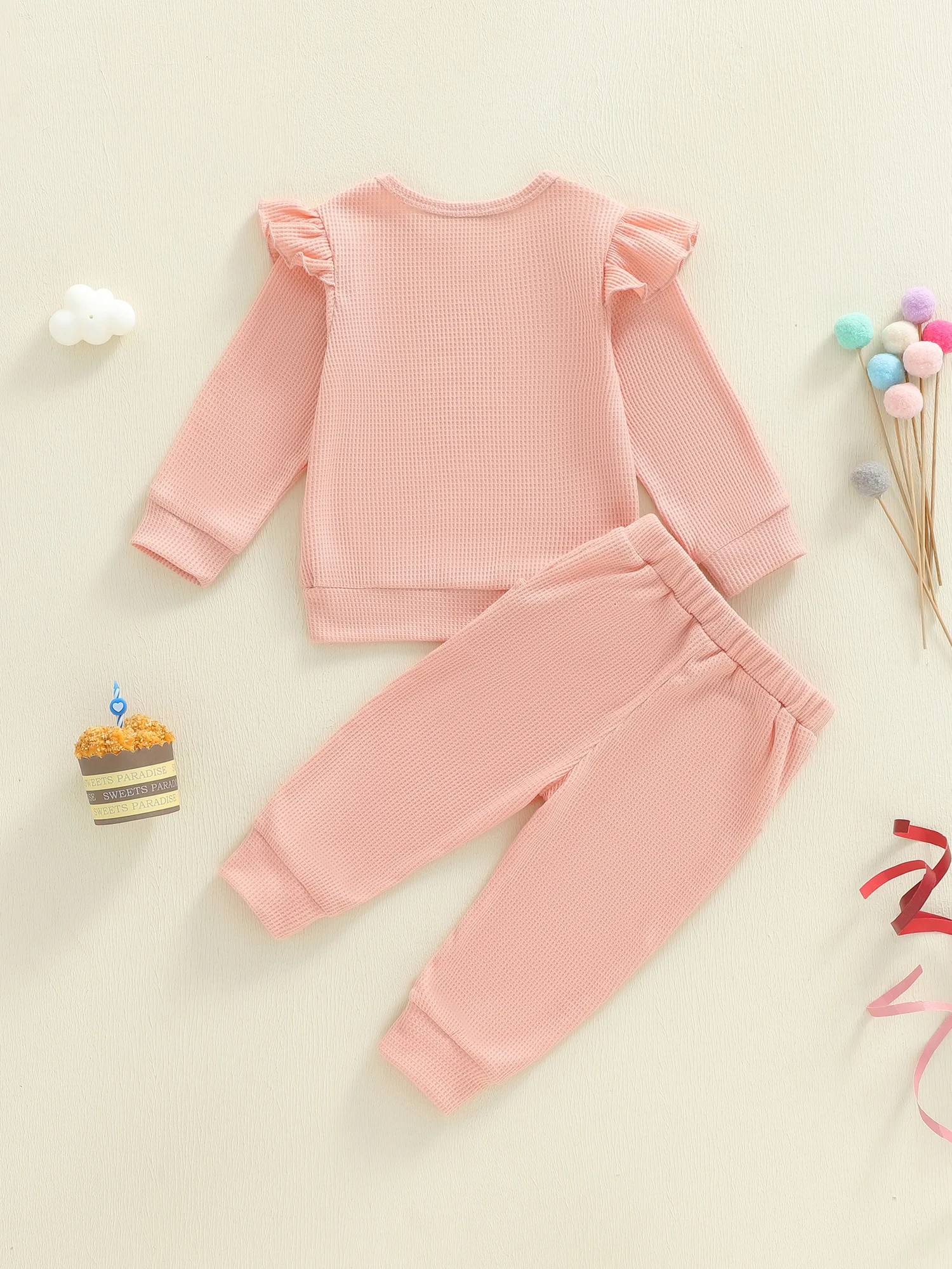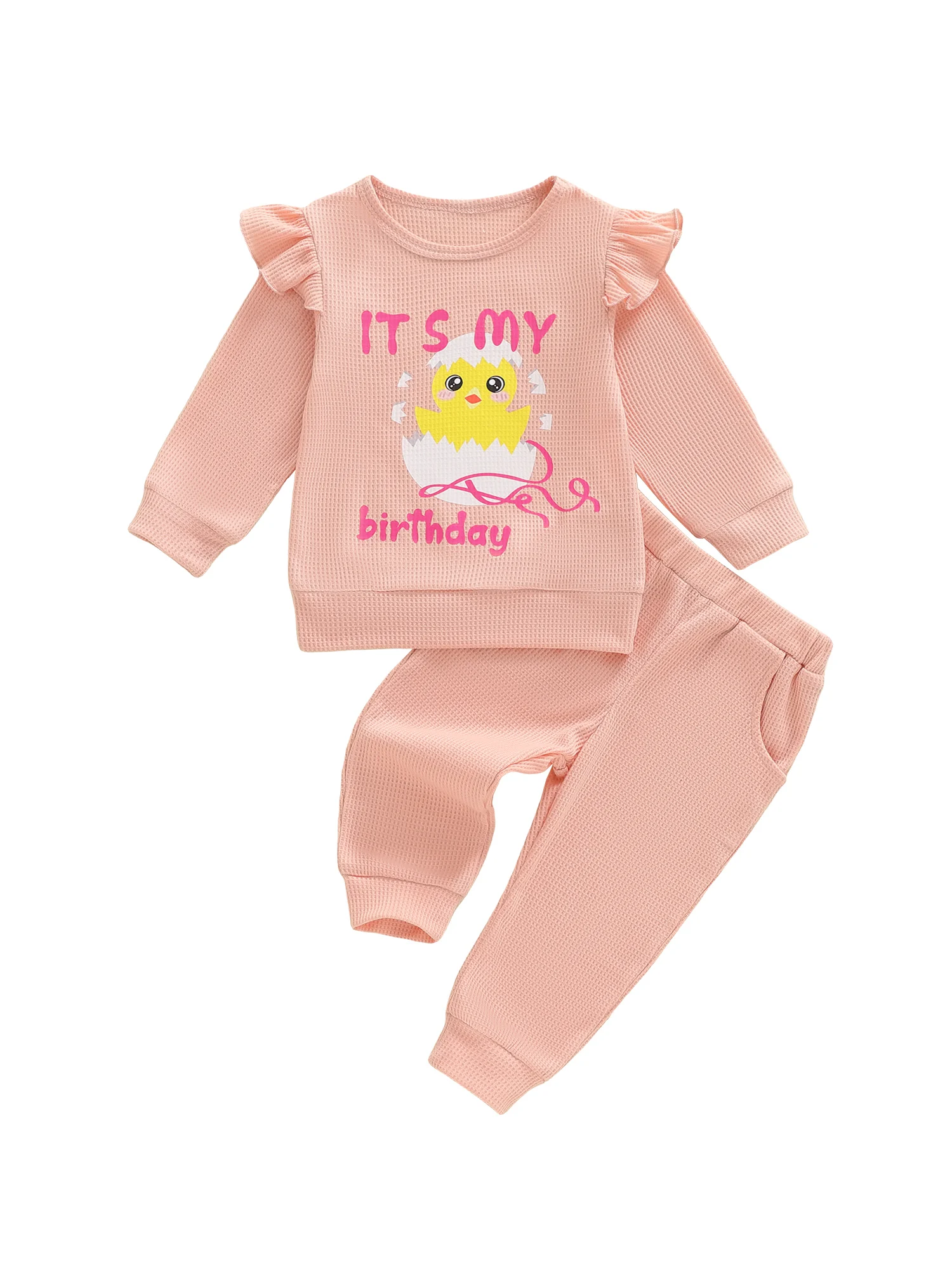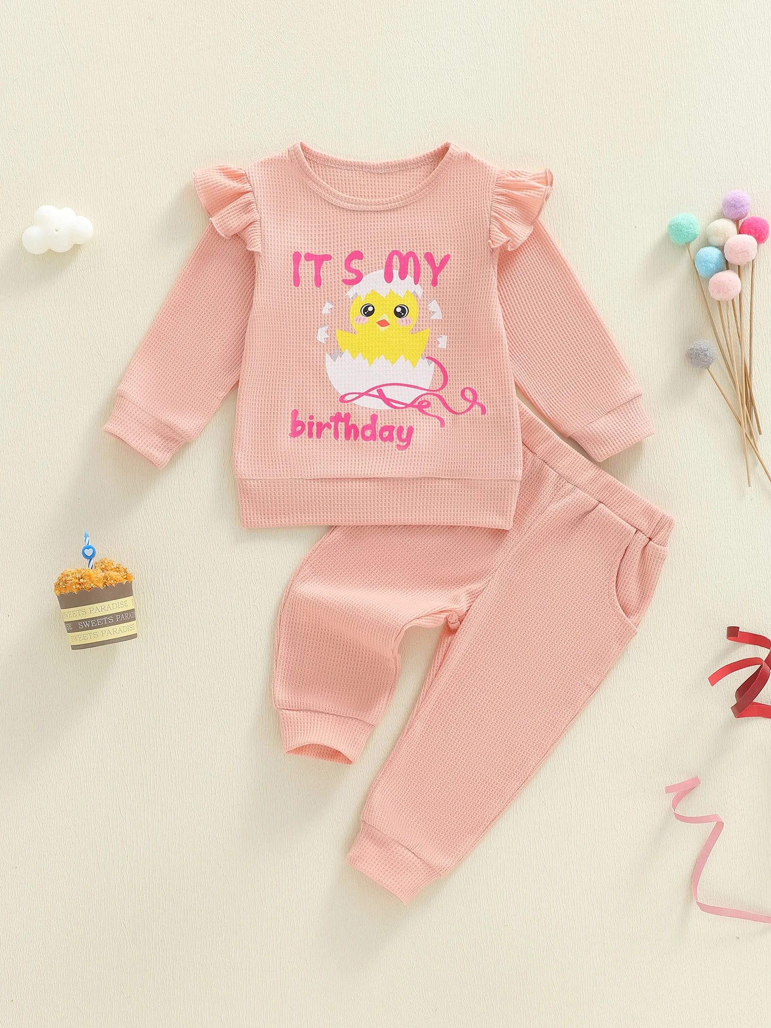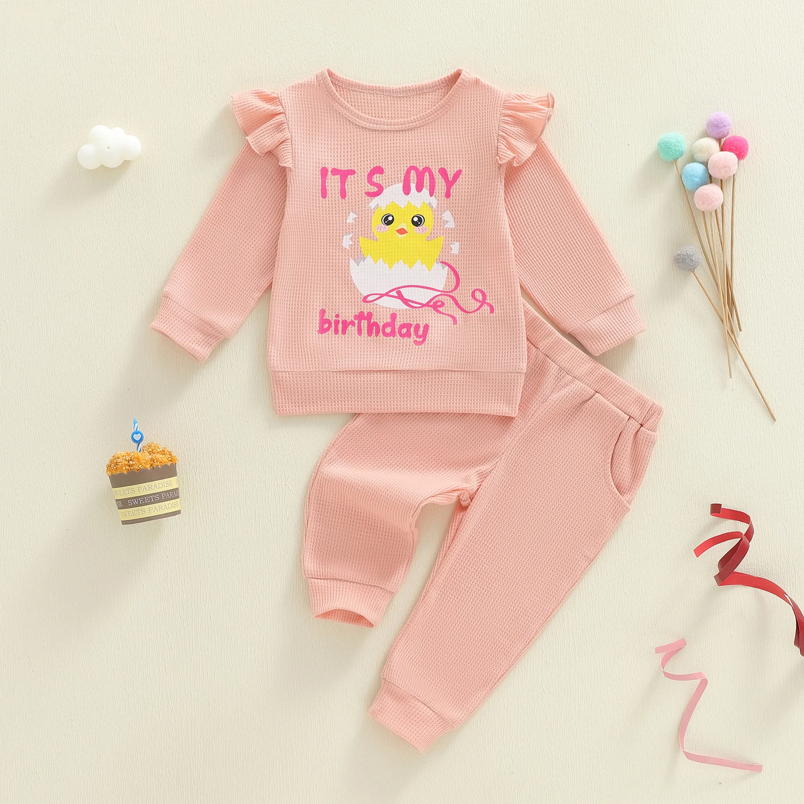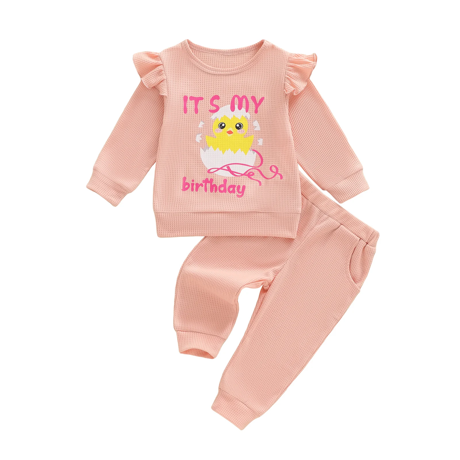 Baby Birthday 2 Piece Outfits Letter Chicken Print Long Sleeve Crew Neck Tops and Elastic Waist Pants Set