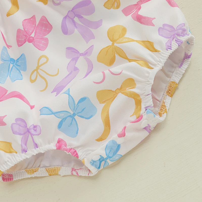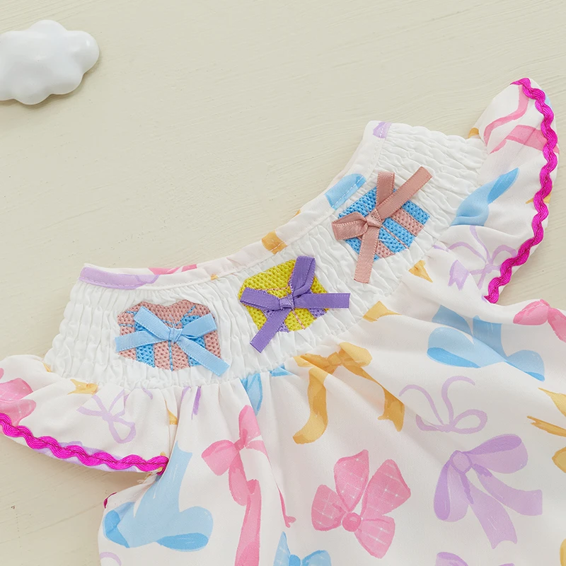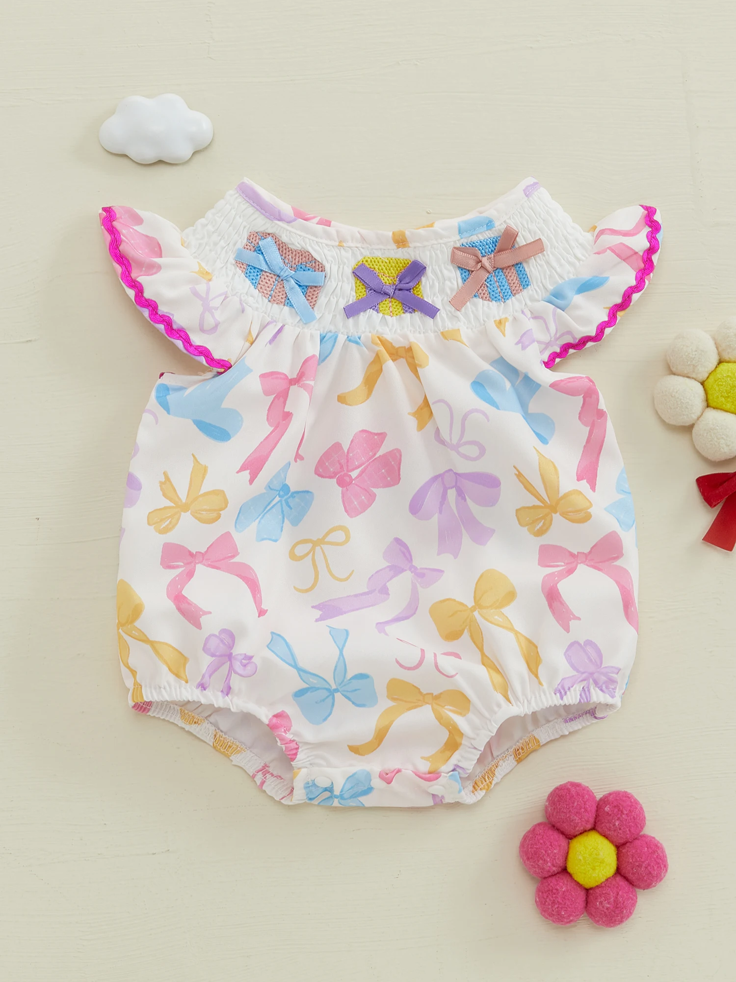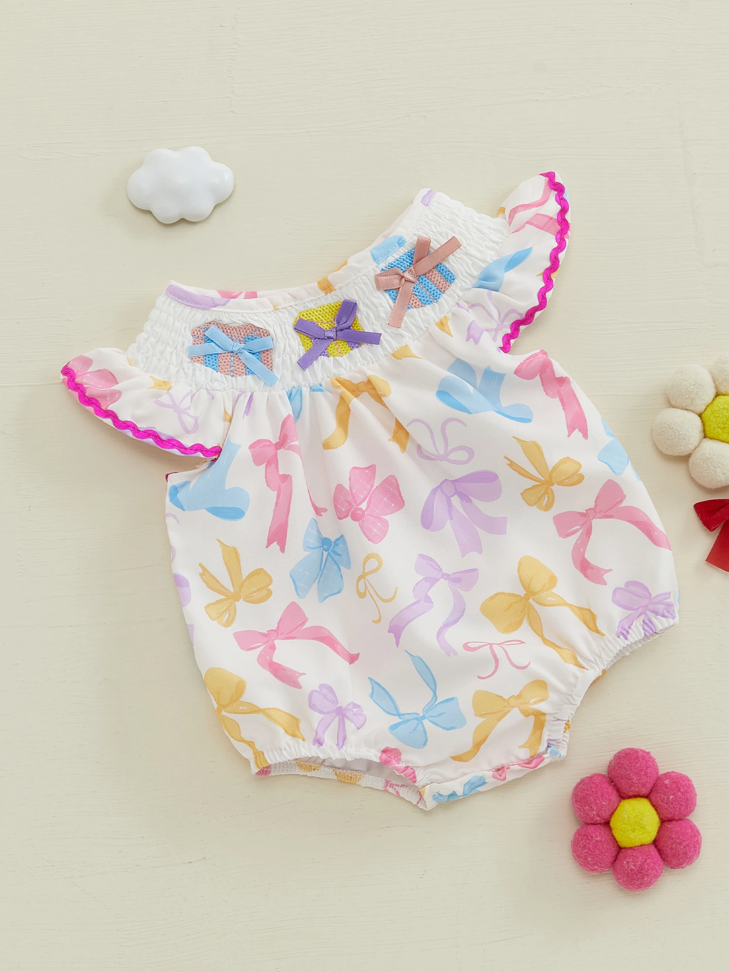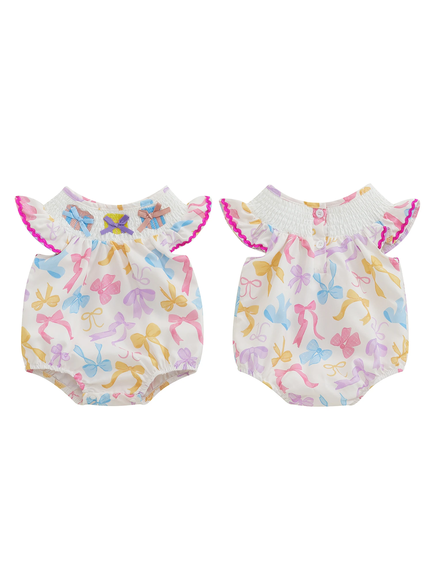 Baby Girl Birthday Romper Ruffle Sleeveless Round Neck Bow Print Smocked Bodysuit Little Girl Playsuit